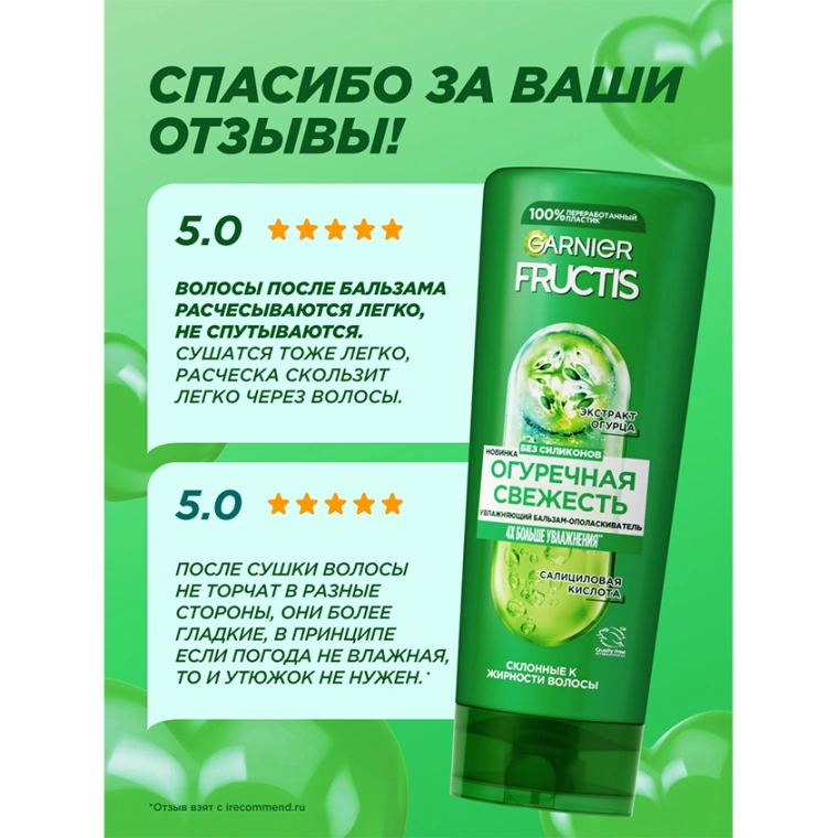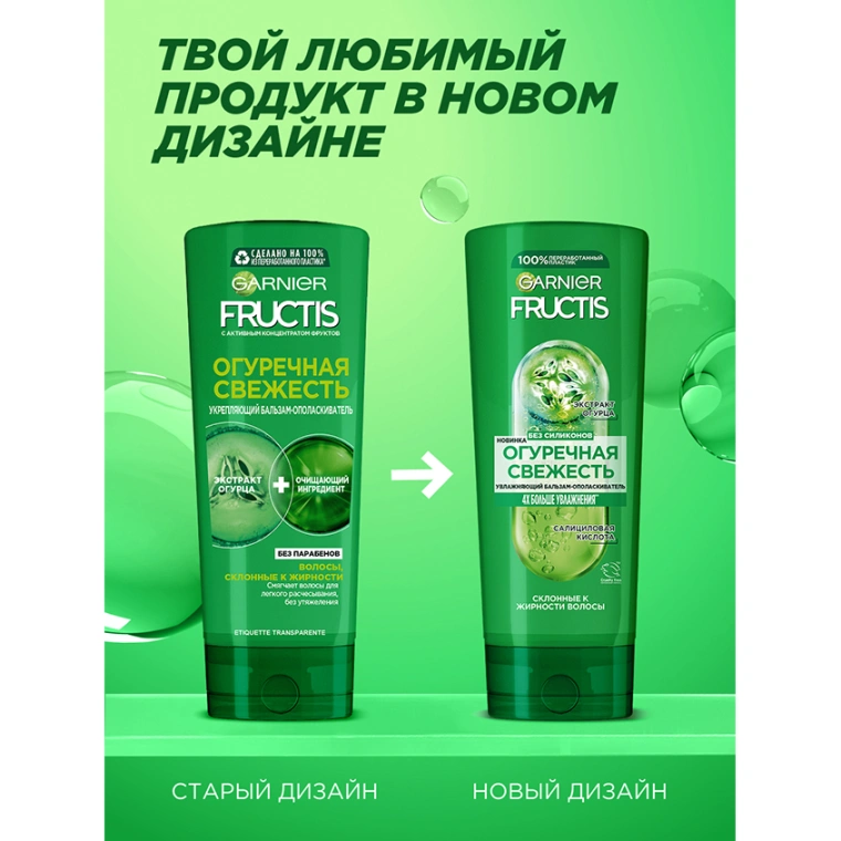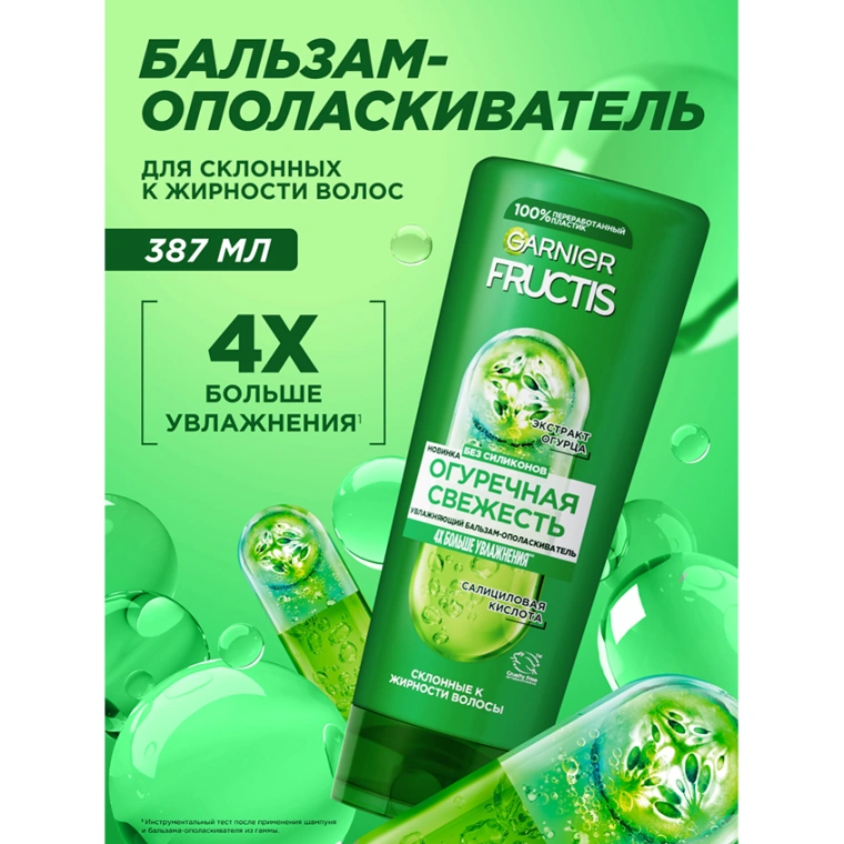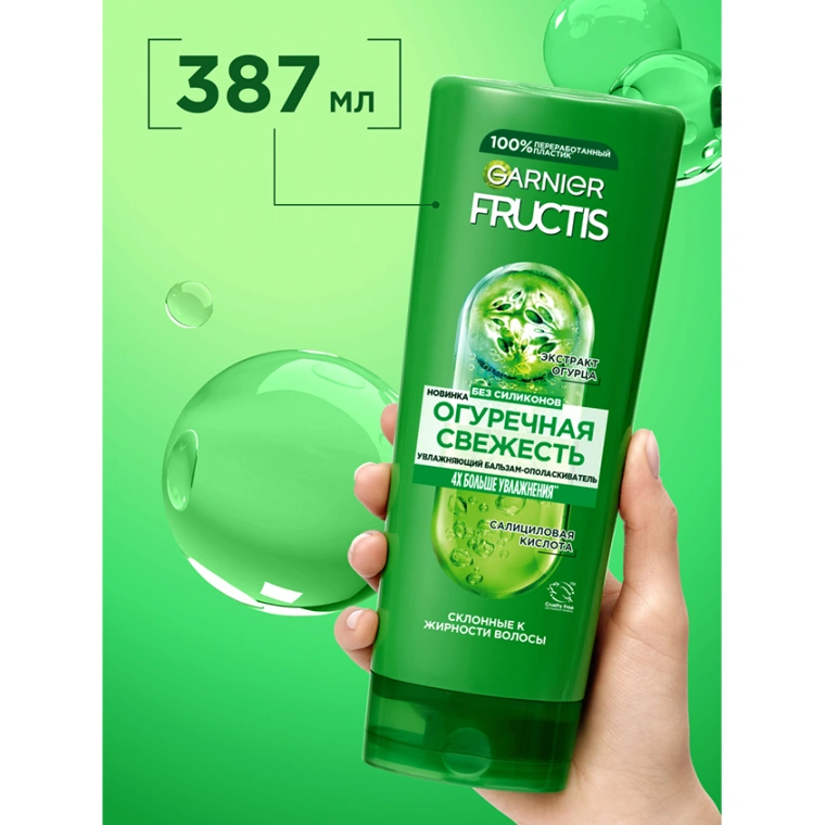 Устали от волос, которым не хватает легкости и свежести? Представляем бальзам для волос Fructis Огуречная Свежесть, обогащенный экстрактом огурца и салициловой кислотой. Бальзам увлажняет волосы, придает им мягкость, гладкость и облегчает расчесывание. Попробуйте и оцените результат: 4Х больше увлажнения*!