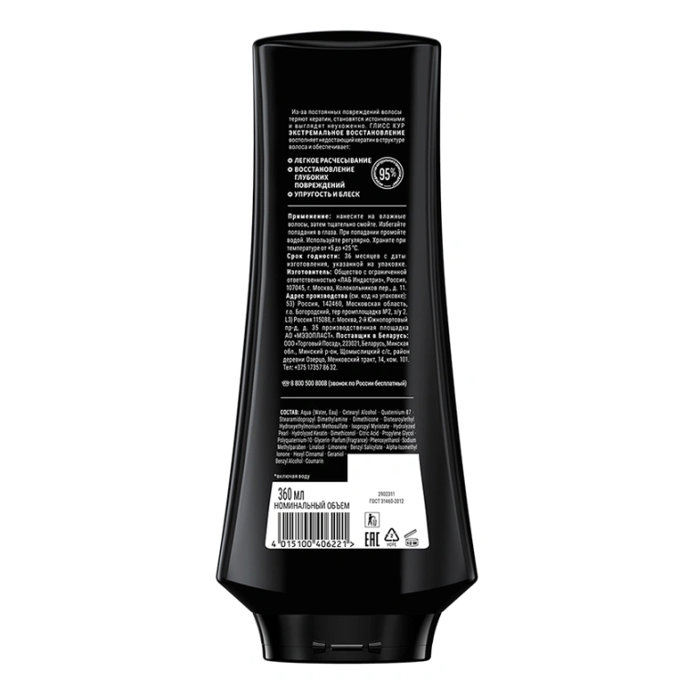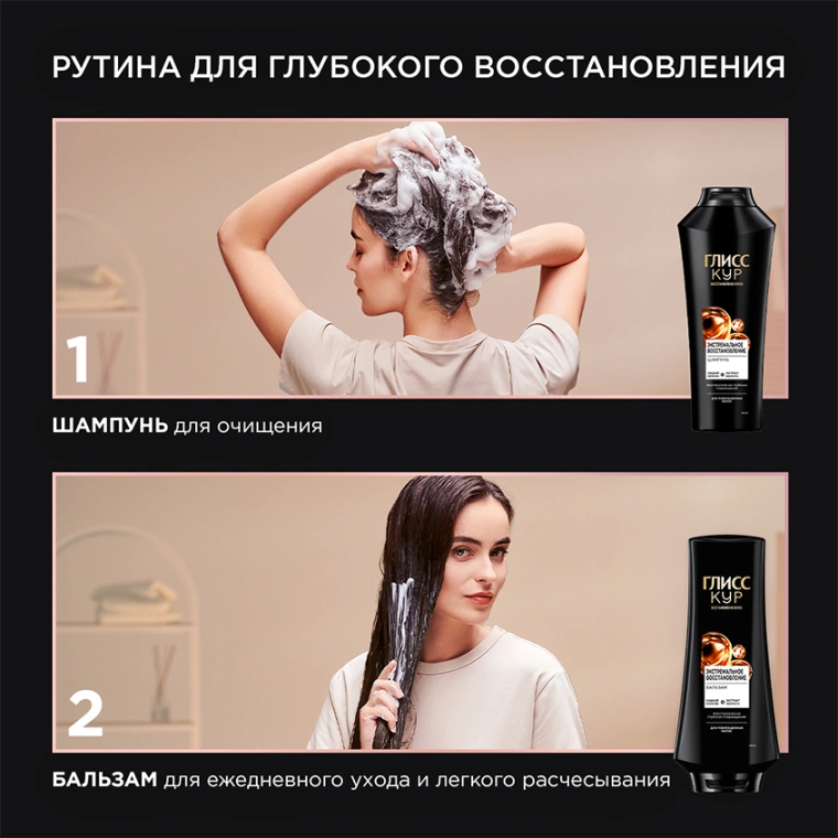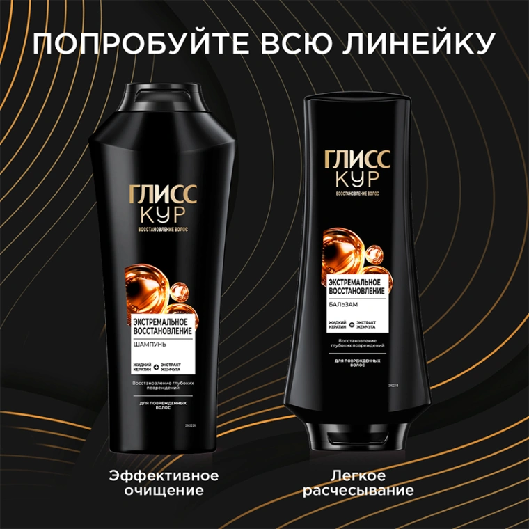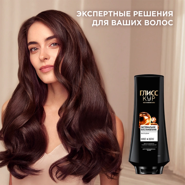 ГЛИСС КУР ЭКСТРЕМАЛЬНОЕ ВОССТАНОВЛЕНИЕ восполняет недостающий кератин в структуре волоса и обеспечивает: