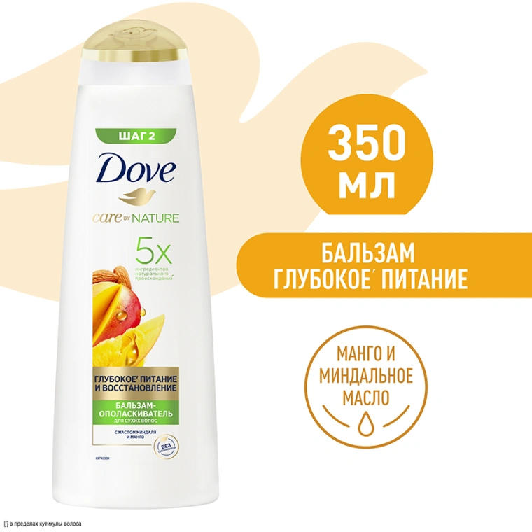 Результат: бережное эффективное восстановление и натуральный уход! Бальзам-ополаскиватель Dove питает и восстанавливает даже очень сухие волосы без утяжеления. Невероятный сочный аромат манго подарит вам особое удовольствие. Мягкие и послушные волосы каждый день!