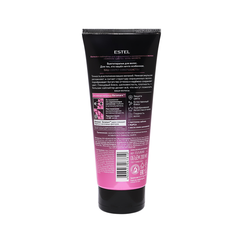 Точность в исполнении ваших желаний. Нежная эмульсия увлажняет и питает структуру окрашенных волос, подчёркивает богатство оттенка и надёжно сохраняет цвет. Глянцевый блеск, шелковистость, плотность — бальзам-хайлайтер делает всё, что могут пожелать ваши волосы.