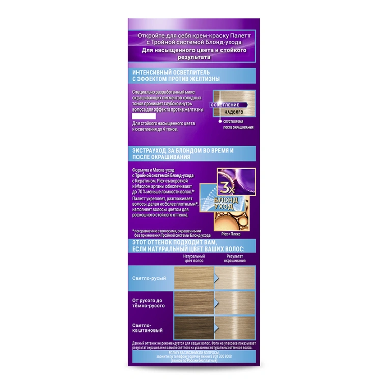 "Интенсивный осветлитель с эффектом против желтизны. Экстрауход за блондом во время и после окрашивания.