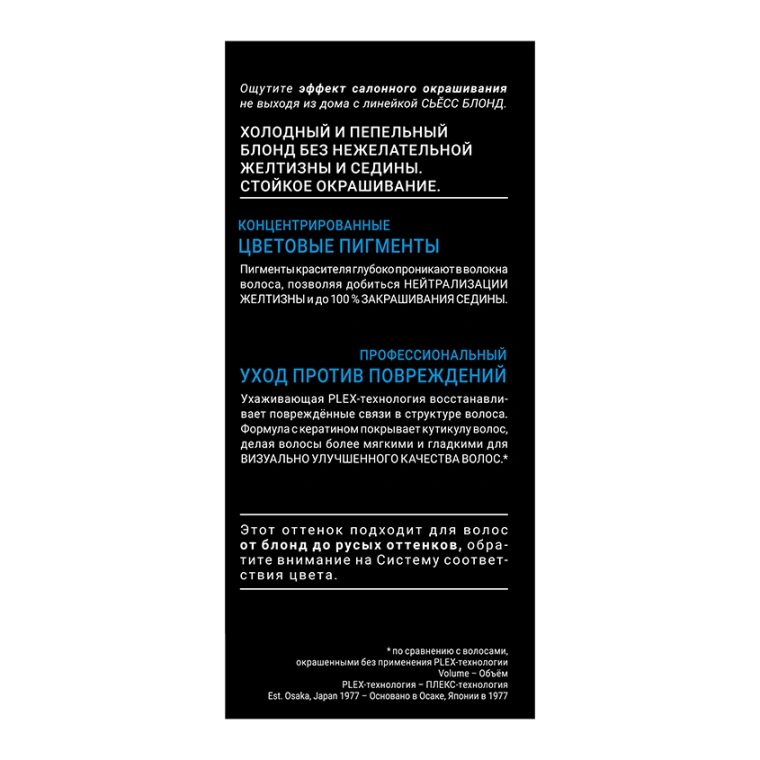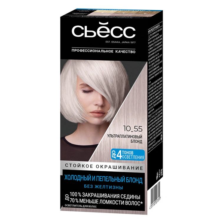 "Осветлитель для волос СЬЁСС Ультраплатиновый блонд 10_55. Ледяной блонд без желтизны с холодными пигментами и системой против повреждений. Пигменты красителя глубоко проникают в волокна волоса и нейтрализуют желтизну, позволяя добиться ХОЛОДНОГО БЛОНДА и ПРОФЕССИОНАЛЬНОГО ЗАКРАШИВАНИЯ СЕДИНЫ. Ухаживающая технология SALONPLEX реставрирует повреждённые связи в структуре волоса и восстанавливает волосы изнутри. Формула с кератином покрывает кутикулу волос, делая их более мягкими и гладкими. Для ВИЗУАЛЬНО УЛУЧШЕННОГО КАЧЕСТВА ВОЛОС* и ДО 70 % МЕНЬШЕ ЛОМКОСТИ ВОЛОС*.
