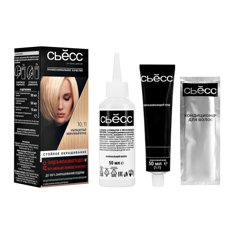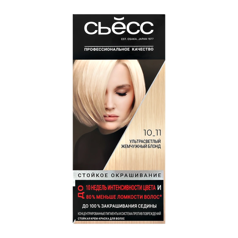 Стойкая крем-краска для волос СЬЁСС Ультра-светлый жемчужный блонд 10-11 с концентрированными цветовыми пигментами и системой против повреждений.