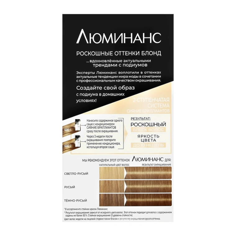 * Результат окрашивания зависит от исходного цвета волос. Этот оттенок подходит для волос с содержанием седины не более 50%. Стойкое окрашивание (3 уровень стойкости).