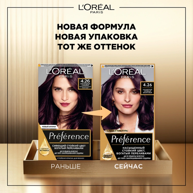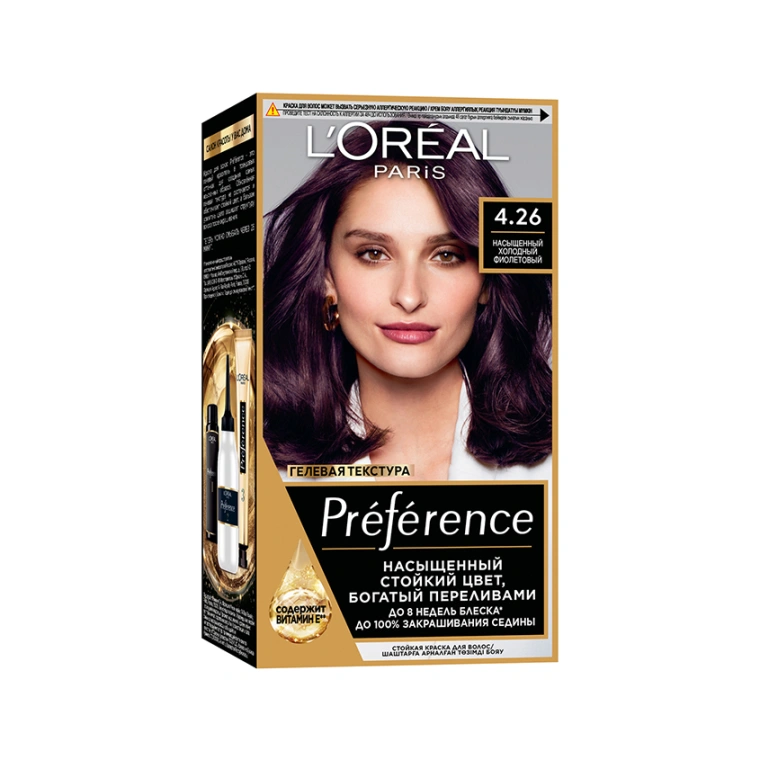 Краска для волос Л'Ореаль Париж "Преферанс" - премиальное качество окрашивания! Она создана ведущими экспертами лабораторий Л'Ореаль Париж в сотрудничестве с профессиональным колористом Кристофом Робином. В результате исследований был разработан уникальный состав краски, основанный на более объемных красящих пигментах. Стойкая краска оттенка 4.26, Благородный Сливовый, Насыщенный Холодный Фиолетовый способна дольше удерживаться в структуре волос, создавая неповторимый яркий цвет, устойчивый к вымыванию и возникновению тусклости. Комплекс Экстраблеск добавит блеска насыщенному цвету волос. Красивые шелковые волосы с насыщенным цветом на протяжении 8 недель после окрашивания!