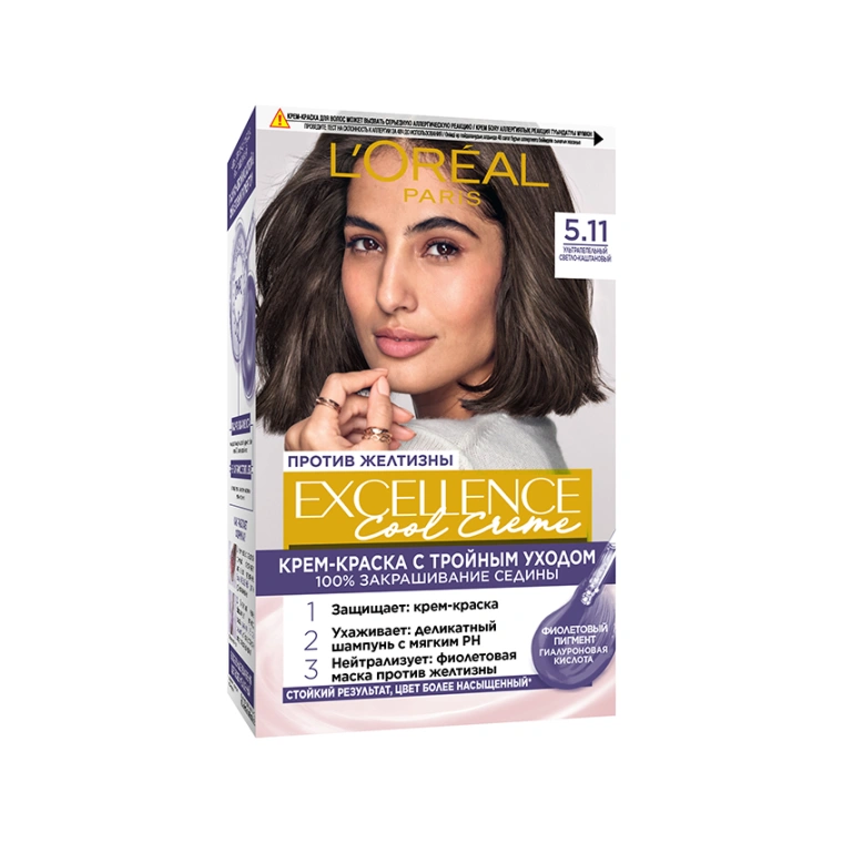 Стойкая крем-краска для волос ультрапепельных оттенков для блондинок и брюнеток Excellence Cool Creme 5.11, Ультрапепельный Светло-Каштановый - 100% закрашивание седины и тройной уход за кожей головы и волосами: