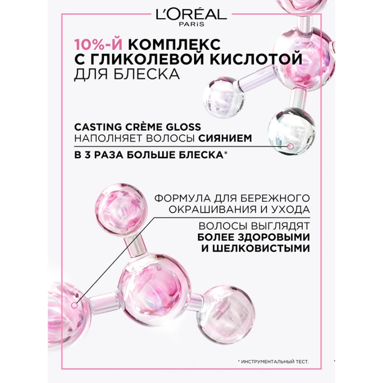 Усиленная 10%-м комплексом "Ультраблеск*" с гликолевой кислотой, краска-уход Casting crème gloss обеспечит зеркальный блеск надолго.