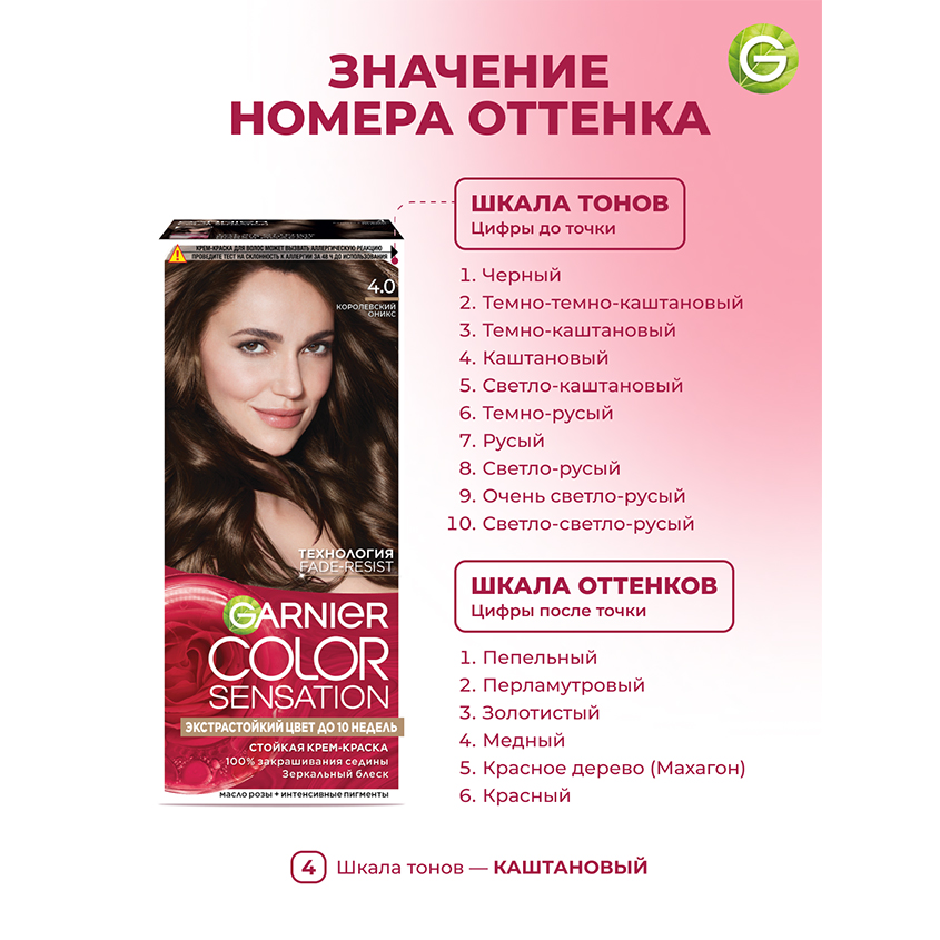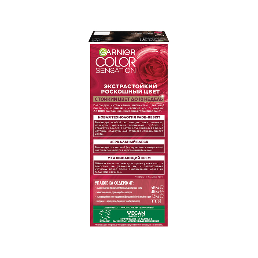 Стойкая крем-краска Color Sensation от Garnier. Благодаря интенсивным пигментам и эссенции розы цвет еще более насыщенный и стойкий до 10 недель (Инструментальный тест), а волосы отражают свет и переливаются зеркальным блеском. Обволакивающая текстура крем-ухода от Гарньер, обогащенного эссенцией розы, ухаживает за волосами и делает их мягкими и шелковистыми. Изысканный цветочный аромат краски Колор Сенсейшен превращает окрашивание в истинное удовольствие. До 100% закрашивание седины. Делает волосы блестящими. Обволакивающая текстура не течет.