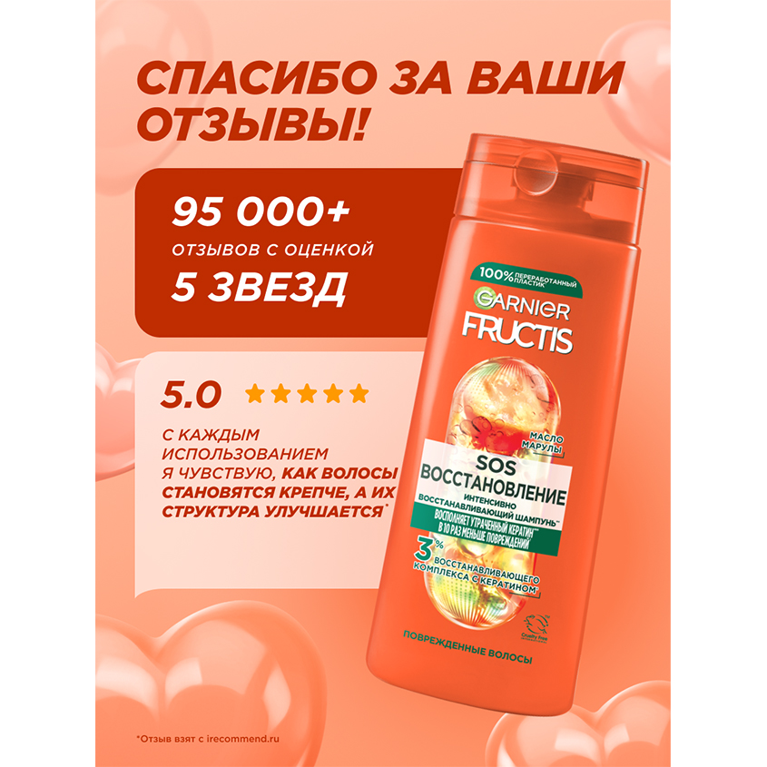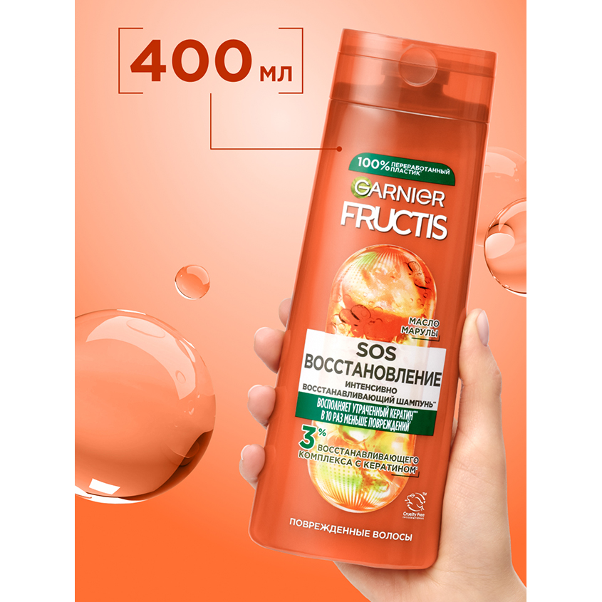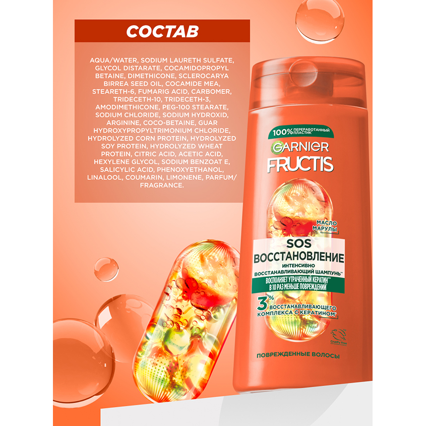 Секущиеся кончики, ломкость и сухость – это про твои волосы? Fructis SOS Восстановление — шампунь, созданный для возвращения силы и красоты поврежденным, тонким и безжизненным волосам. Обогащен растительным кератином и маслом марулы, делает волосы в 10 раз более крепкими и в 7 раз более гладкими’!