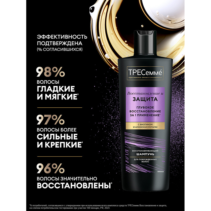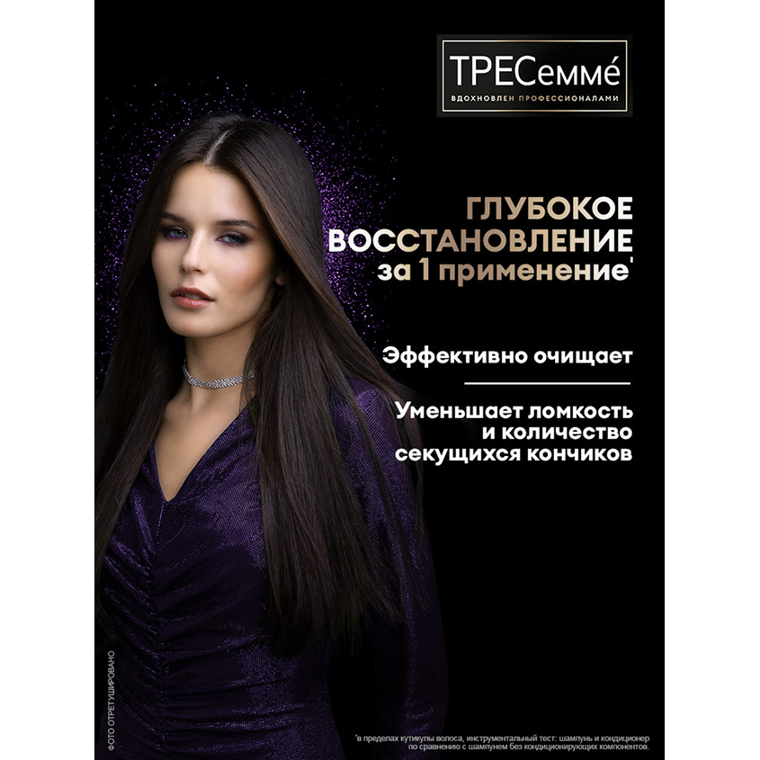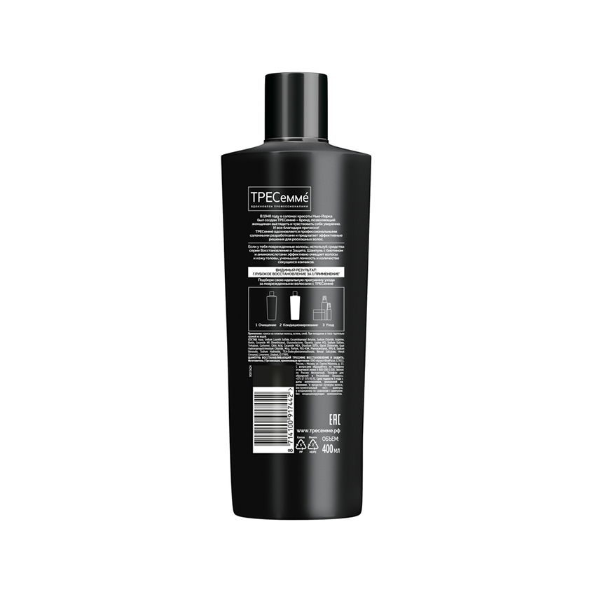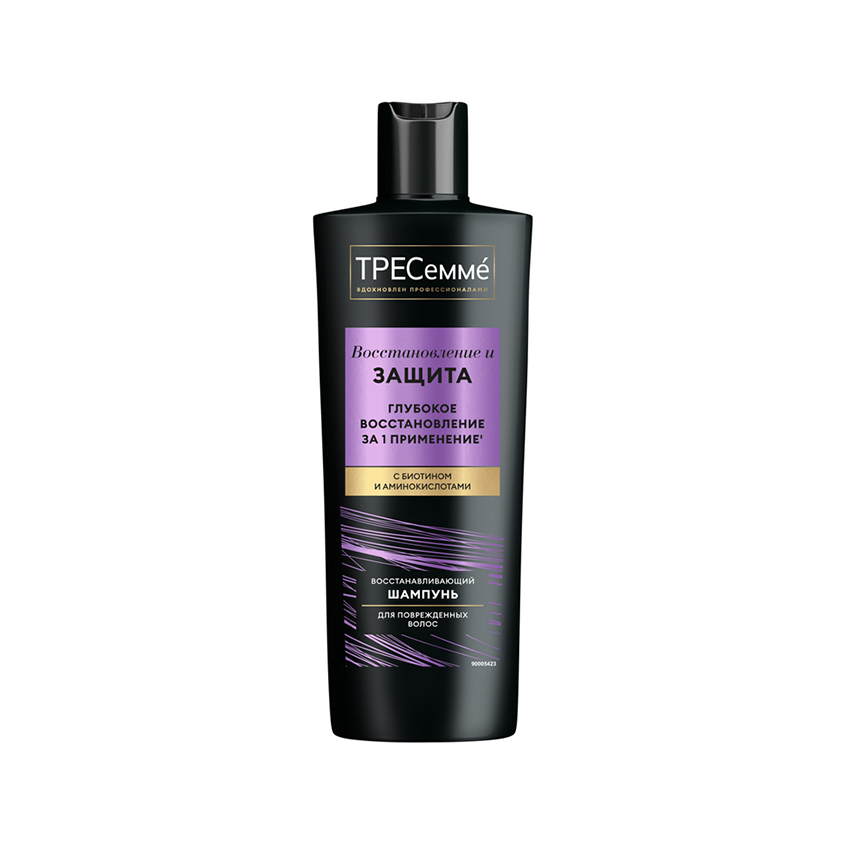 "ТРЕСеммé Восстановление и Защита — шампунь восстанавливающий для волос, обогащенный биотином и аминокислотами. Шампунь оказывает помощь для безжизненных волос и действует сразу в нескольких направлениях: