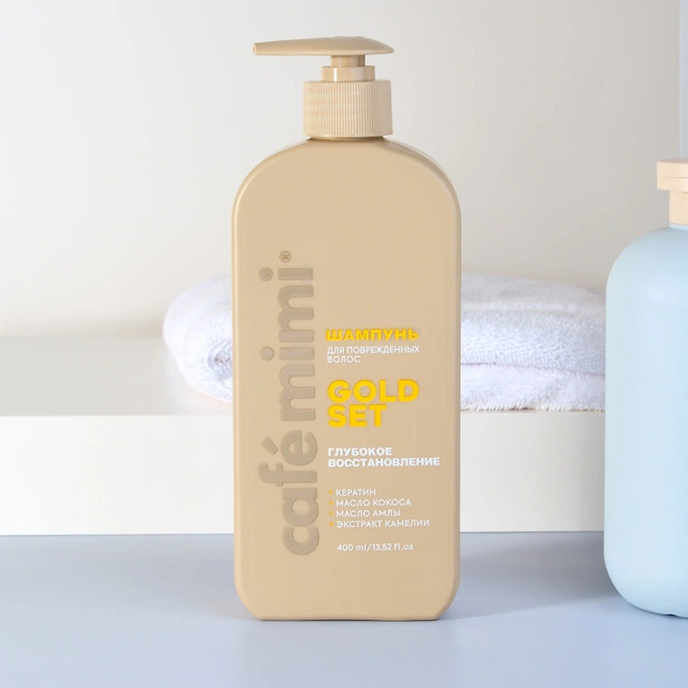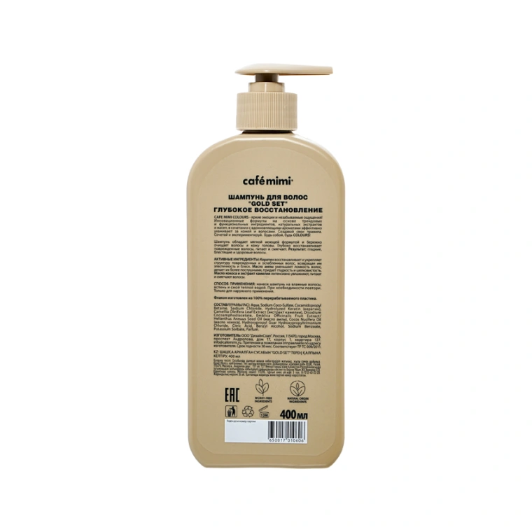 Aqua, Sodium Coco-Sulfate, Cocamidopropyl Betaine, Sodium Chloride, Hydrolyzed Keratin (кератин), Camellia Oleifera Leaf Extract (экстракт камелии), Disodium Cocoamphodiacetate, Emblica Officinalis Fruit Extract/ Helianthus Annuus Seed Oil (масло амлы), Cocos Nucifera Oil (масло кокоса), Hydroxypropyl Guar Hydroxypropyltrimonium Chloride, Citric Acid, Benzyl Alcohol, Sodium Benzoate, Potassium Sorbate, Parfum.