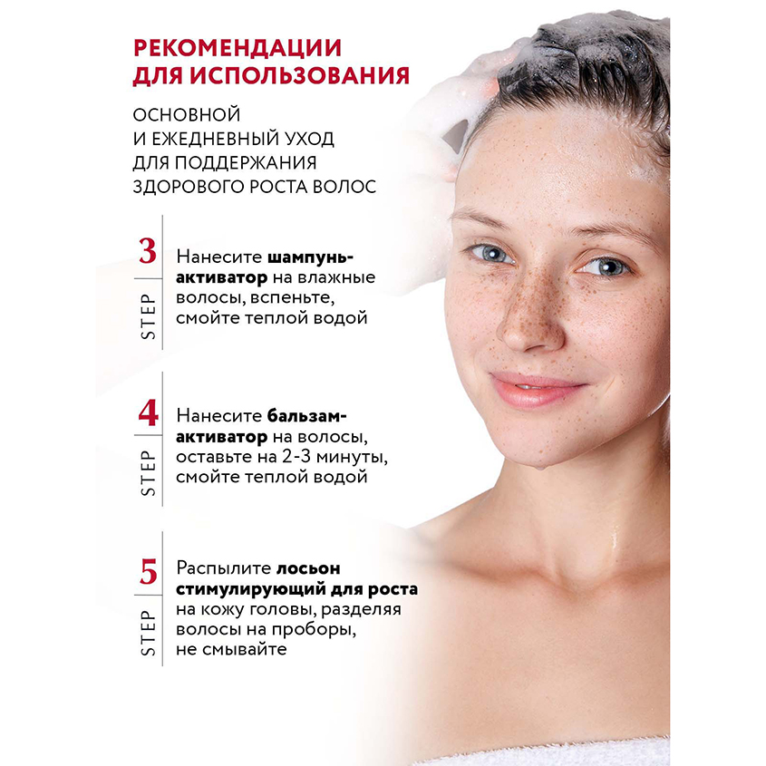 ШАМПУНЬ-АКТИВАТОР на основе биотина стимулирует спящие фолликулы, останавливая выпадение и активизируя рост новых здоровых волос. Увлажняет и укрепляет волосы, создает прикорневой объём, придает эластичность и блеск. БИОТИН укрепляет волосы от корней до кончиков, предотвращает их выпадение и повышает густоту. Регулирует деятельность сальных желез. КОФЕИН И НИАЦИНАМИД тонизируют и усиливают приток крови к волосяным луковицам, стимулируя рост. Д-ПАНТЕНОЛ защищает от температурных перепадов и воздействия стайлинговых средств, снижает ломкость и сечение кончиков.