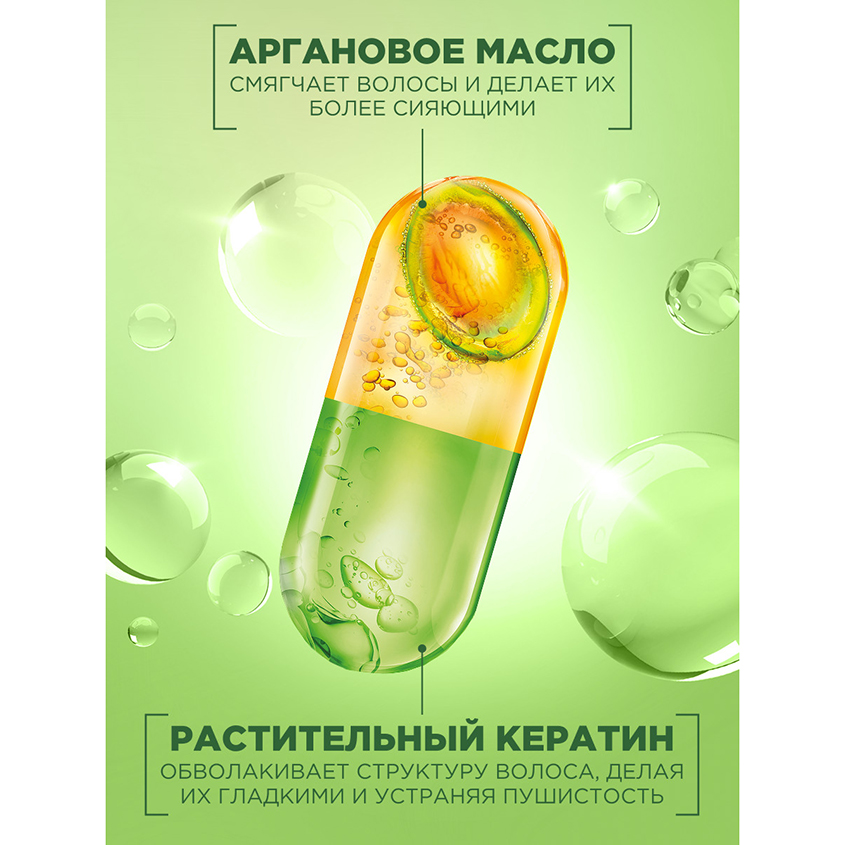 - Комплекс [аргановое масло + растительный кератин]: смягчает и придает блеск от корней до самых кончиков, устраняет пушистость.