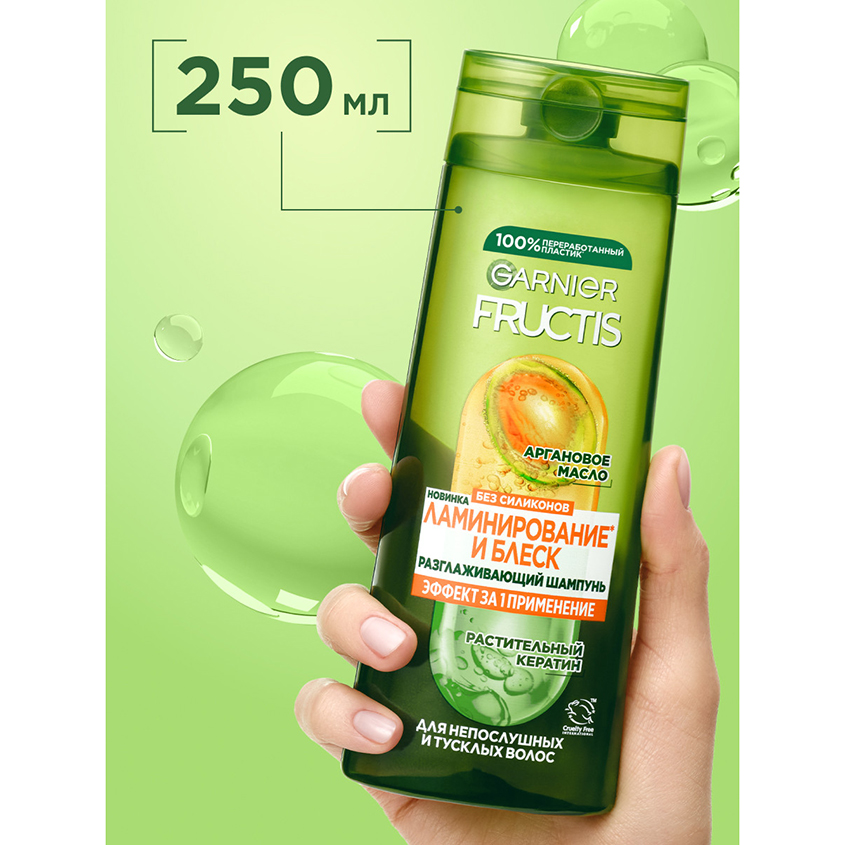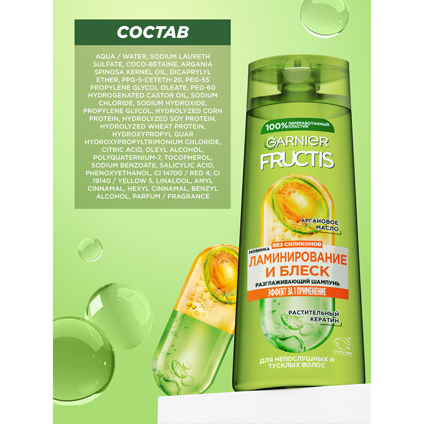 Знакомо чувство, когда непослушные волосы нарушают все планы? А что, если можно быть уверенной в их безупречном виде: гладкие, послушные и ухоженные — в любой ситуации? Добавь в свою рутину ухода разглаживающий шампунь для волос Fructis Ламинирование и Блеск, обогащенный растительным кератином и аргановым маслом! Формула шампуня создана специально для ухода за непослушными тусклыми волосами и помогает вернуть им блеск уже после одного применения!*