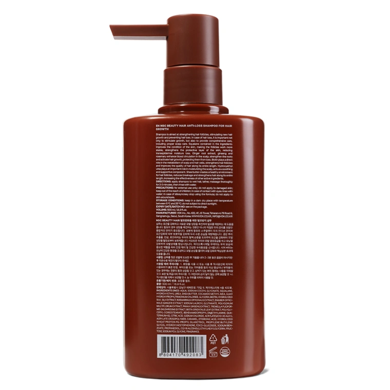 Шампунь направлен на укрепление волосяных фолликулов, стимуляцию роста новых волос и предотвращение выпадения. При выпадении волос важно не только стимулировать рост, но и обеспечить комплексный уход, включающий правильный уход за кожей головы. Входящий в состав сквалан улучшает состояние кожи, благодаря чему фолликулы работают стабильнее, укрепляет защитный слой кожи, снижая трансэпидермальную потерю влаги. Экстракты корня имбиря, женьшеня и розмарина усиливают кровообращение в коже головы, укрепляют корни и активируют рост волос, защищая их от выпадения. Биотин играет непосредственную роль в метаболизме клеток кожи головы и волос, укрепляет волосяные фолликулы и улучшает качество волос по всей длине. Гидроксиэтилмочевина играет важную роль в увлажнении кожи головы, действует как успокаивающий и поддерживающий компонент. Масло ши создаёт здоровую среду для волосяных фолликулов, снижает ломкость и укрепляет волосы по всей длине, повышая эффективность других активных компонентов.