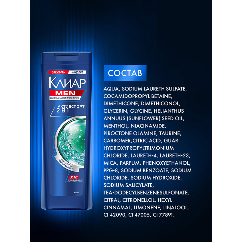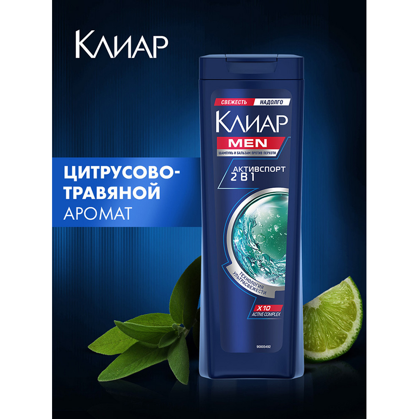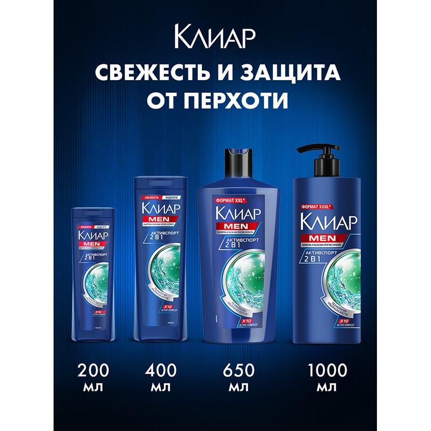 "Шампунь и бальзам-ополаскиватель для волос мужской от перхоти Клиар Men Активспорт 2в1 - это эффективное средство для ухода за кожей головы и волосами для мужчин, которых беспокоит повышенная жирность кожи головы и частое появление перхоти. Эффективно очищает, как шампунь, питает и увлажняет, как бальзам-ополаскиватель!