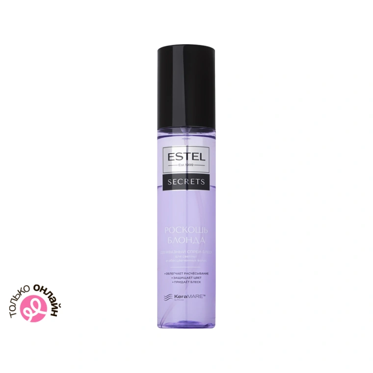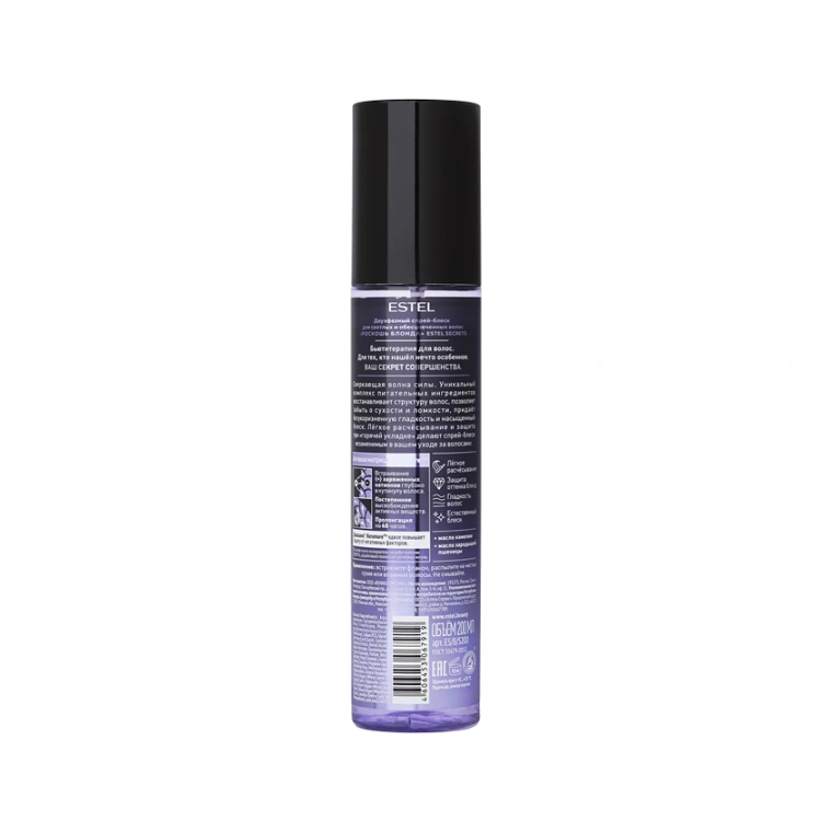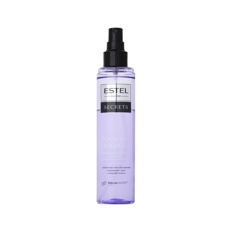 ESTEL SECRETS СПРЕЙ-БЛЕСК ДВУХФАЗНЫЙ ДЛЯ СВЕТЛЫХ И ОБЕСЦВЕЧЕННЫХ ВОЛОС РОСКОШЬ БЛОНДА - сверкающая волна силы. Уникальный комплекс питательных ингредиентов восстанавливает структуру волос, позволяет забыть о сухости и ломкости, придаёт безукоризненную гладкость и насыщенный
