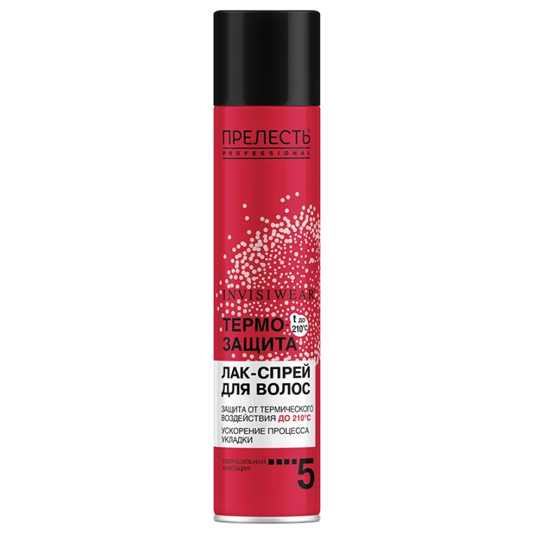 Термозащитный лак-спрей для горячей укладки Прелесть Professional Invisiwear обеспечивает защиту при нагревании до 230C0 и минимизирует повреждения, создавая на волосах термостойкую вуаль, которая защищает волосы от воздействия высоких температур во время применения термических приборов, а также легко фиксирует волосы, продлевая стойкость и упругость укладки, не утяжеляет и не склеивает волосы, убирает излишнюю пушистость, что позволяет надолго сохранить как безупречные локоны, так и идеально гладкие пряди.