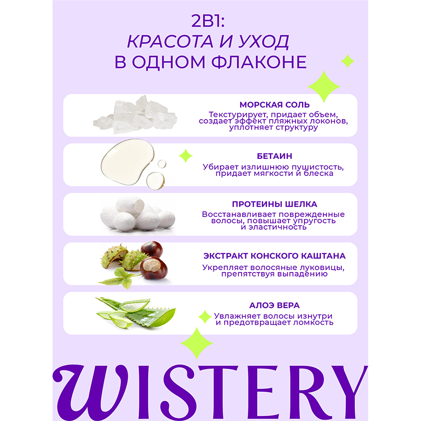 Текстурирующий спрей с натуральной морской солью для укладок в стиле легкой пляжной небрежности. Мгновенно придает волосам долговременный прикорневой объем и выразительную матовую текстуру. Мягкая формула легко смывается, не оставляет липких наслоений и не утяжеляет волосы. Экстракт конского каштана в составе позволяет укрепить волосяные луковицы, препятствуя выпадению и ломкости волос, а протеин шелка увлажняет, разглаживает и придает блеск самым непослушным волосам.