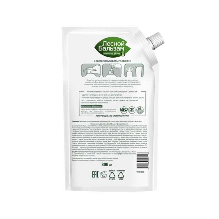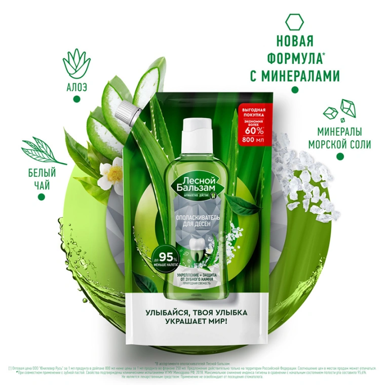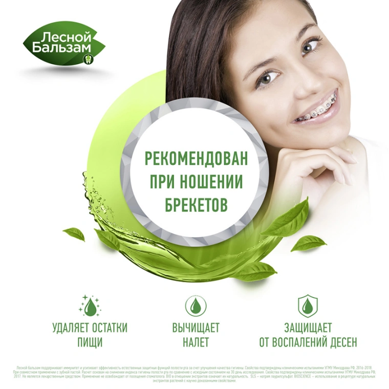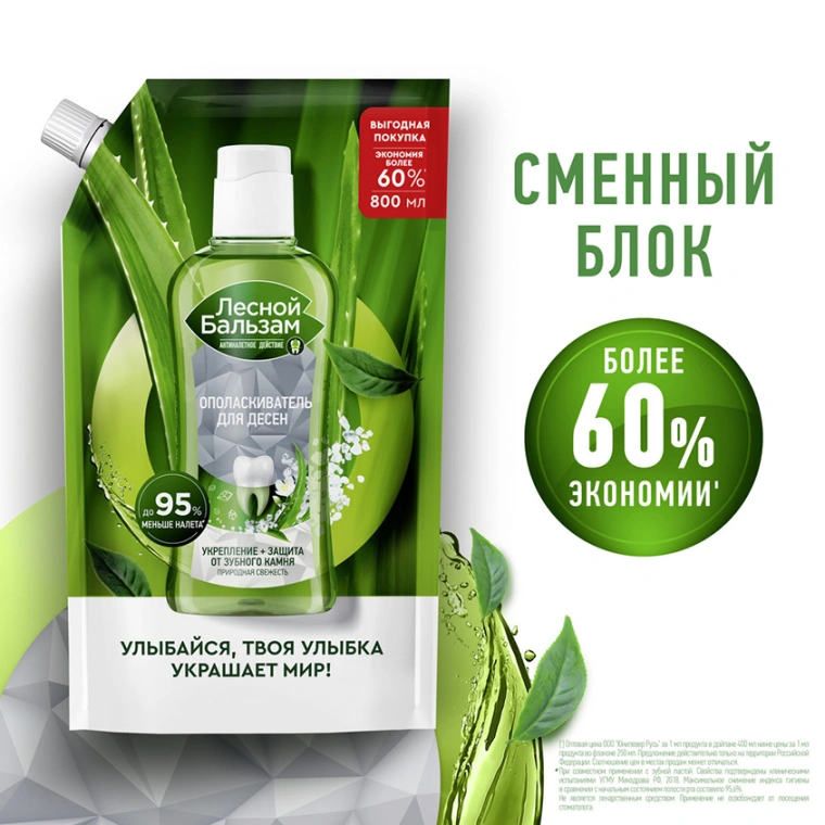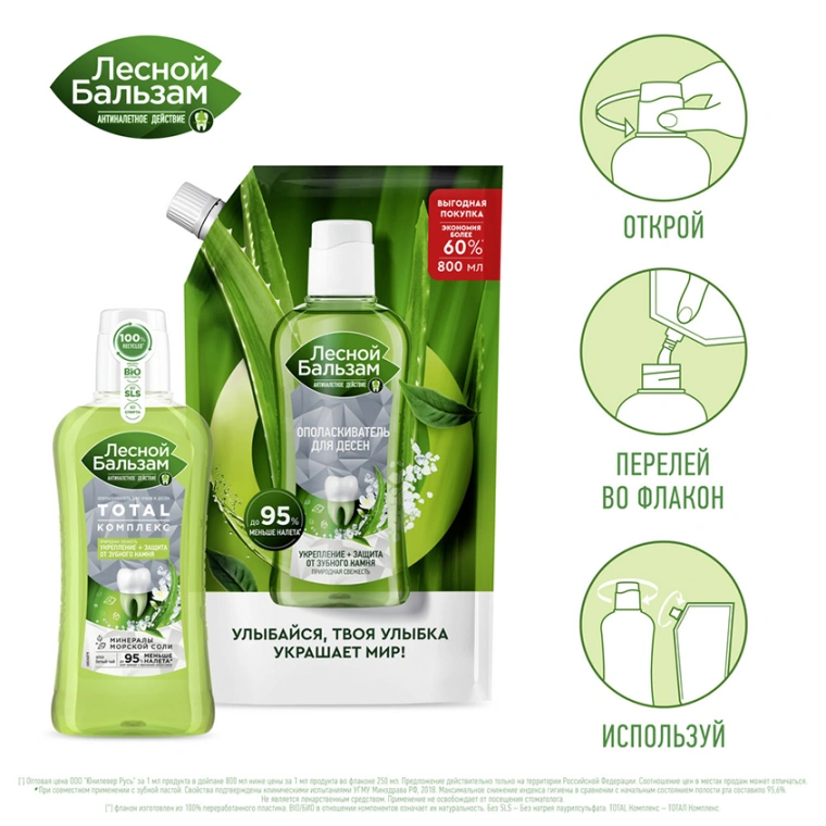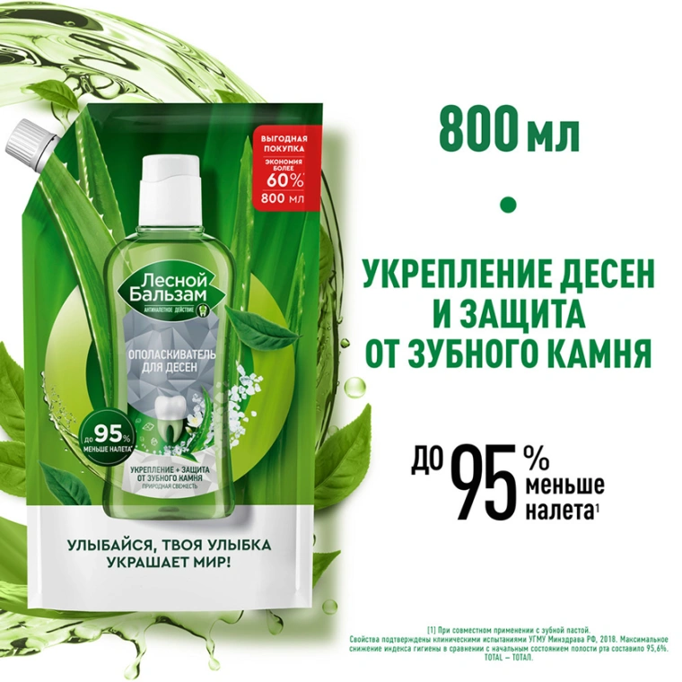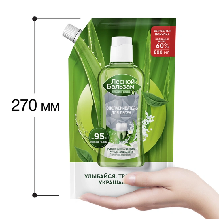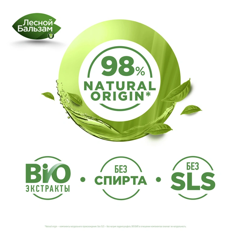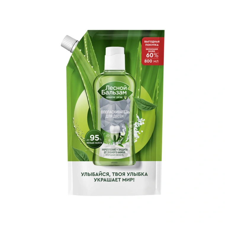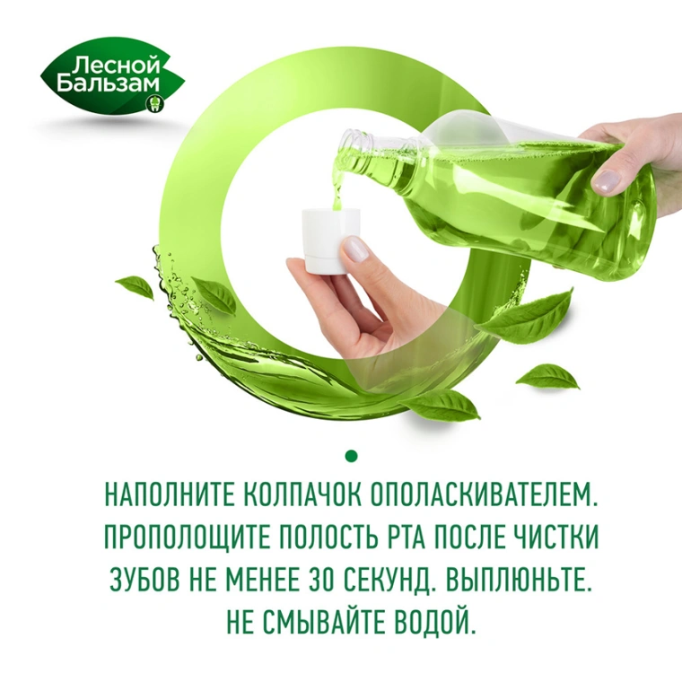 Лесной Бальзам Природная свежесть — ополаскиватель для десен с натуральными ингредиентами и приятным мягким вкусом, предназначенный для комплексной гигиены полости рта от кариеса.