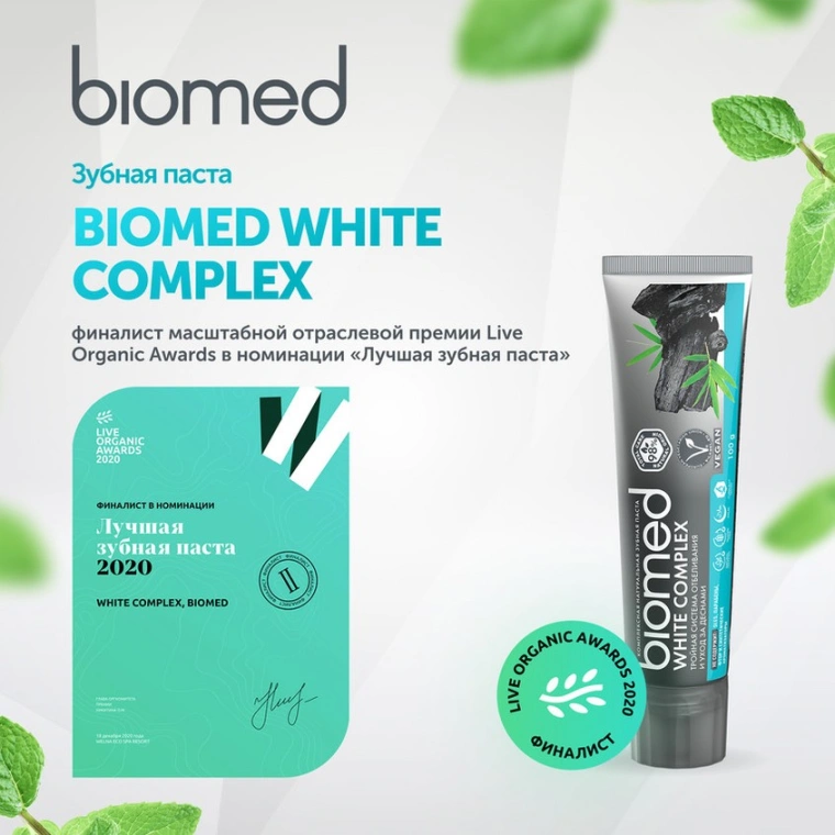 BIOMED® – первая в России линейка гигиенических зубных паст, сочетающих в себе 99% натуральных компонентов и идеальное очищение за 30 секунд на 12 часов. Каждый продукт BIOMED® уникален и содержит индивидуальный комплекс из 12+ активных природных компонентов, что помогает добиваться максимального результата. Натуральные антисептики – экстракт подорожника и полифенолы березы, оказывают противовоспалительное действие за счет фитонцидов и флавоноидов. Они также содержат витамины Е, К, РР, каротин. Натуральные эфирные масла (шалфея, розмарина, тимьяна, мануки, кожуры лимона) защищают от бактерий кариеса и придают восхитительный природный аромат! Инновационные компоненты – гидроксиапатит кальция и L-Arginine – проникают вглубь эмали зубов, укрепляют, придают ей гладкость, делая ее устойчивой к образованию кариеса. Эффективность продуктов BIOMED® подтверждена испытаниями in vitro в лаборатории Cellntec Advanced Cell Systems AG в Швейцарии.