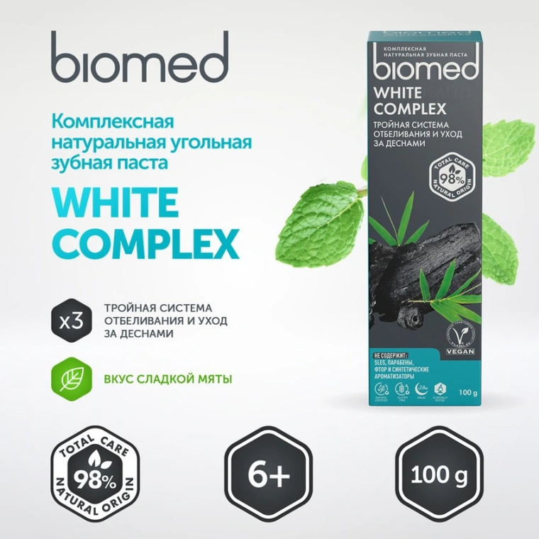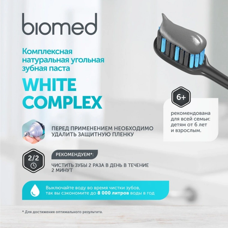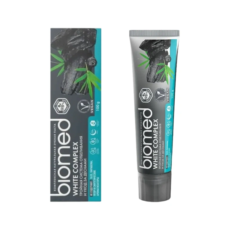 BIOMED WHITE COMPLEX с бамбуковым, активированным и древесным углем эффективно отбеливает ваши зубы, осветляя до 1 тона за 4 недели применения. Ваша улыбка ослепительна