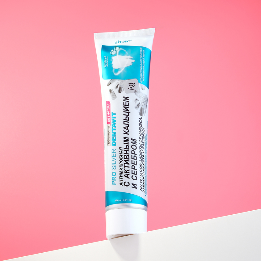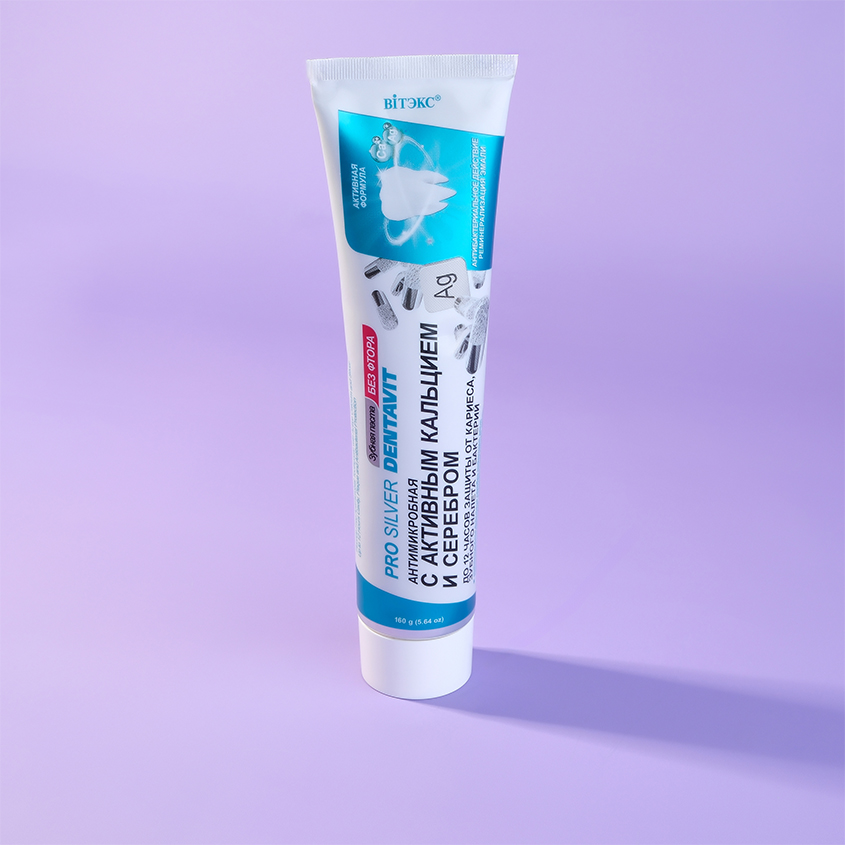 Зубная паста `ВИТЭКС` `DENTAVIT PRO` SILVER С активным кальцием и серебром антимикробная без фтора 160 г