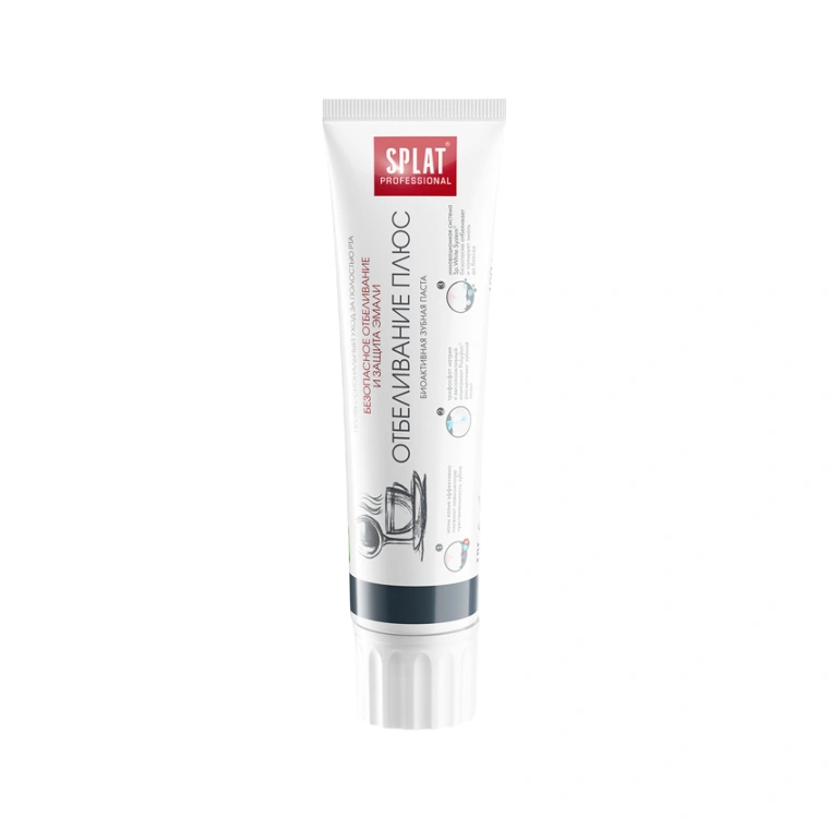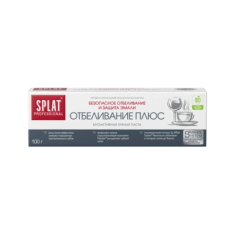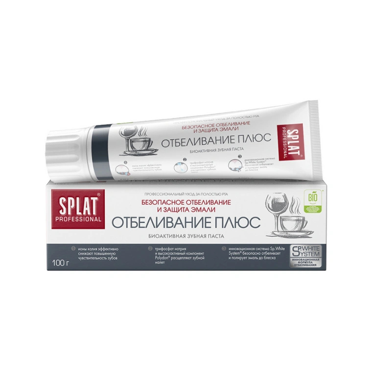 Зубная паста SPLAT Professional «Отбеливание Плюс» (WHITE PLUS) со фтором ухаживает за зубами и безопасно отбеливает их благодаря уникальному чистящему комплексу Sp.White System. Натуральный фермент папаин и высокомолекулярный отбеливающий компонент полидон эффективно расщепляют налет, способствуют сохранению белизны. Ионы калия снижают повышенную чувствительность зубов. Фторид-ионы эффективно защищают от кариеса.