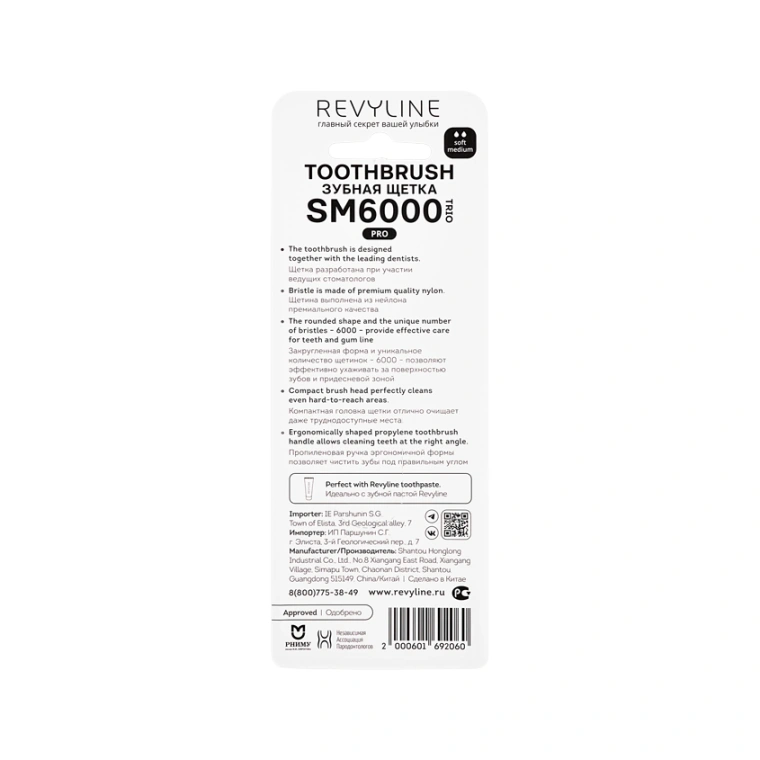 Набор зубных щеток REVYLINE Smart Pro Trio подходит для комплексного ухода за полостью рта. Уменьшенная чистящая головка обеспечивает эффективное очищение даже в труднодоступных местах, а эргономичная ручка делает процесс чистки комфортным и продуктивным. 6000 плотно расположенных мягких щетинок обеспечивают качественное вспенивание пасты и бережную полировку эмали. Набор зубных щеток REVYLINE Smart Pro Trio одобрен Российским медицинским университетом им. Н.И. Пирогова и Независимой Ассоциацией Пародонтологов (НАП).
