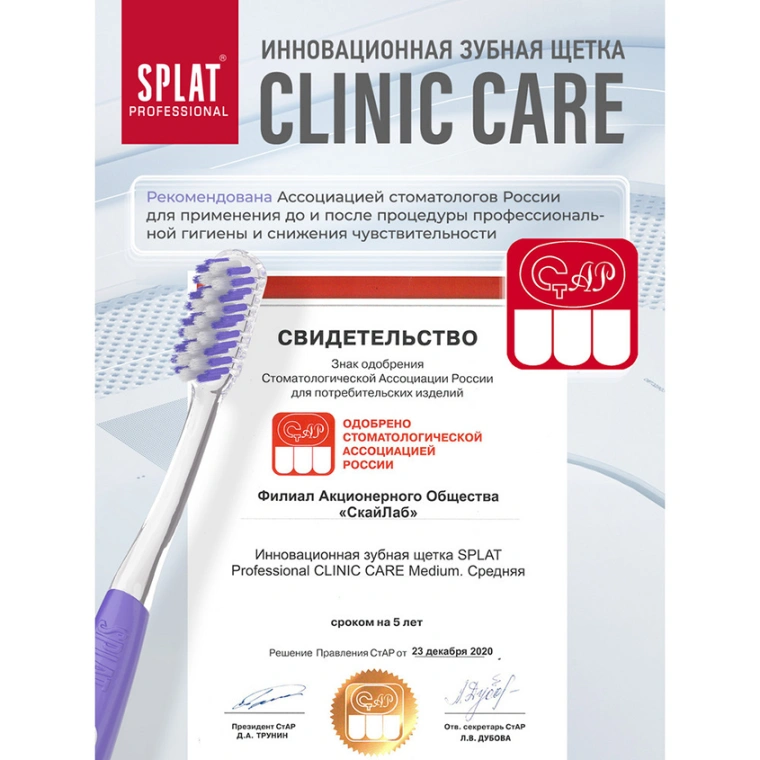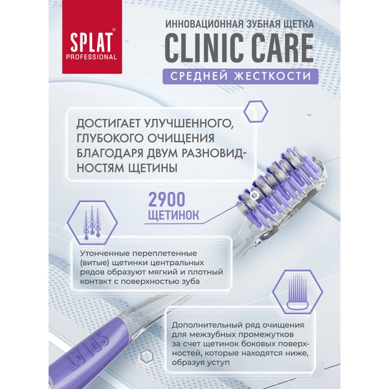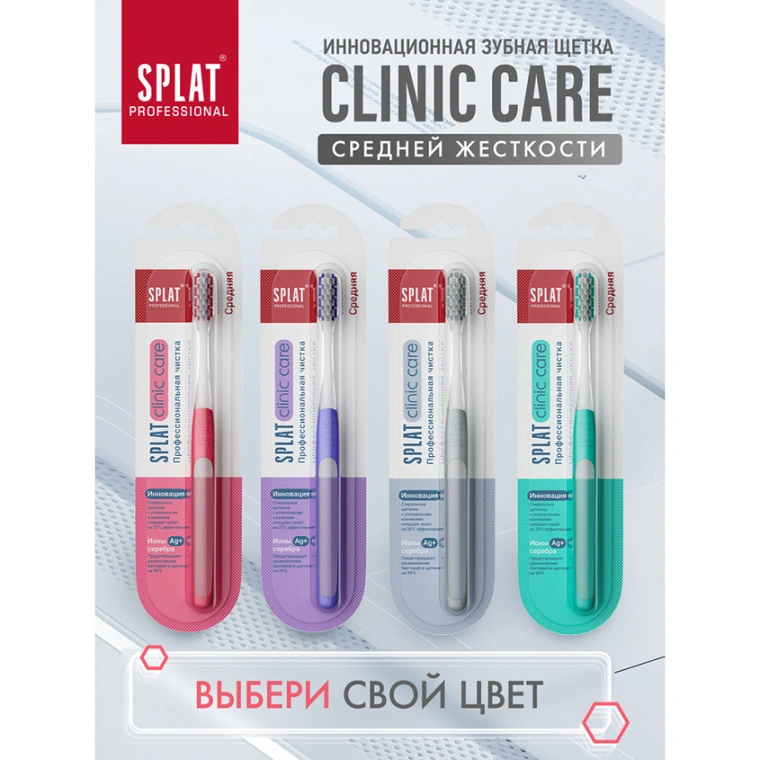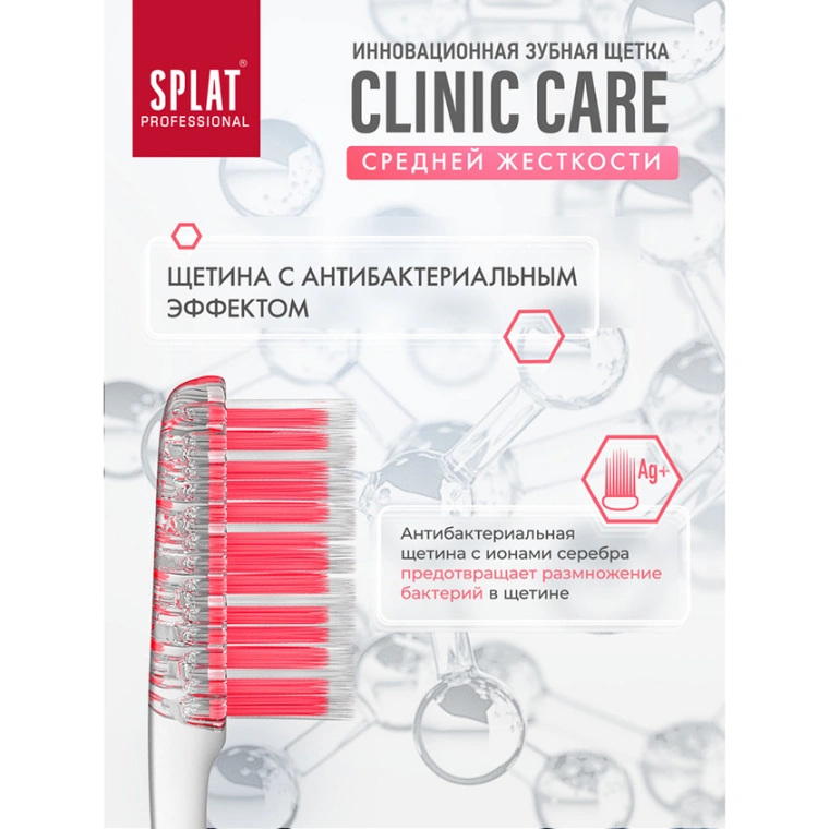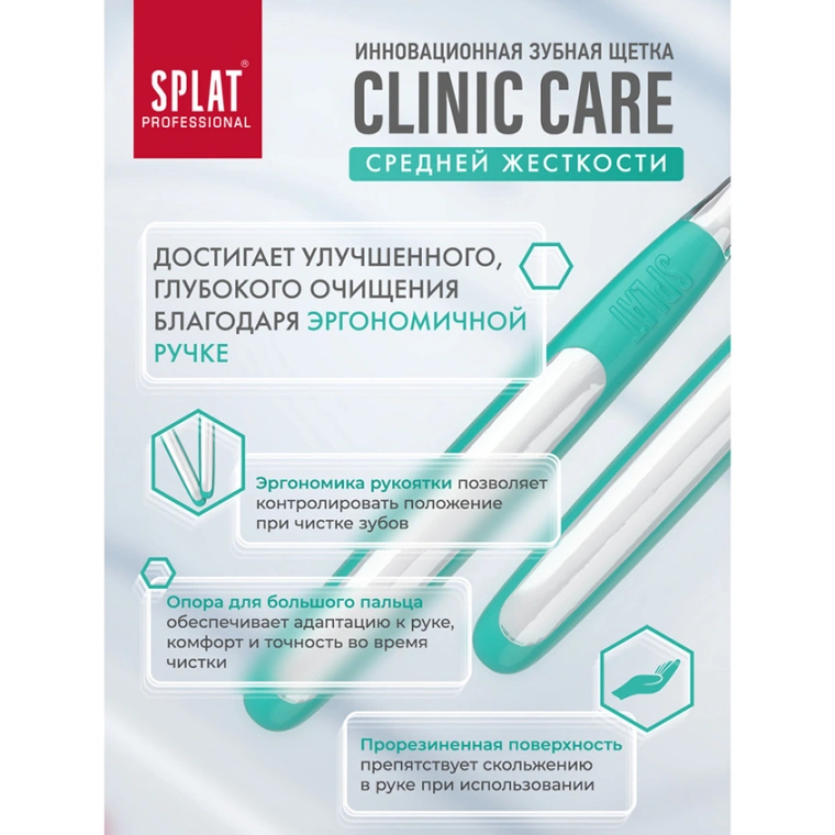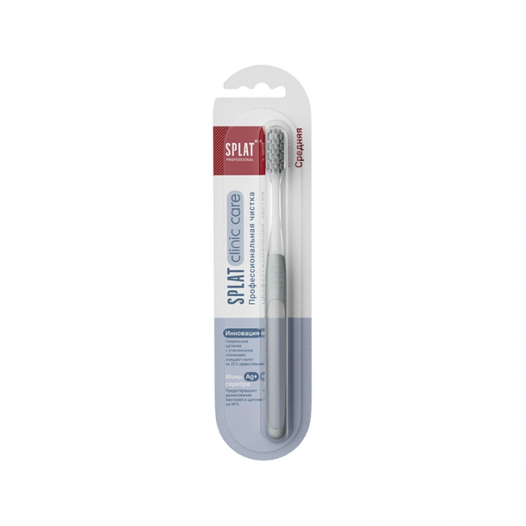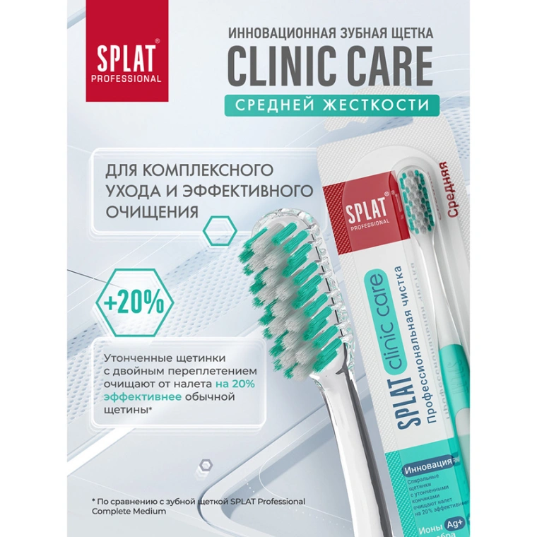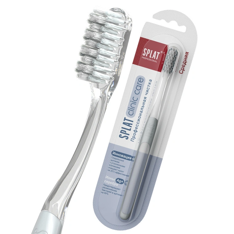 Инновационная уникальная отбеливающая зубная щетка SPLAT Professional CLINIC CARE средней жесткости Medium взрослая. Зубная щетка Clinic Care с двумя видами щетины разной структуры и высоты – это инновация СПЛАТ для глубокой чистки зубов по методу Басса. Эргономичную прорезиненную ручку Clinic Care удобно держать под углом 45 градусов к деснам, контролируя движения и силу давления на зубы. Двухуровневая спиралевидная щетина с ионами серебра на 20 % эффективнее очищает налет, чем обычная гладкая. Утонченные витые щетинки центральных рядов создают мягкий плотный контакт с поверхностью зуба, не травмируя эмаль и десны при чистке в технике Басса. Щетинки боковых поверхностей формируют ряд для очищения межзубных промежутков. Зубные щетки Clinic Care от SPLAT рекомендованы Стоматологической ассоциацией России для ежедневного использования, а также до и после процедуры профгигиены.